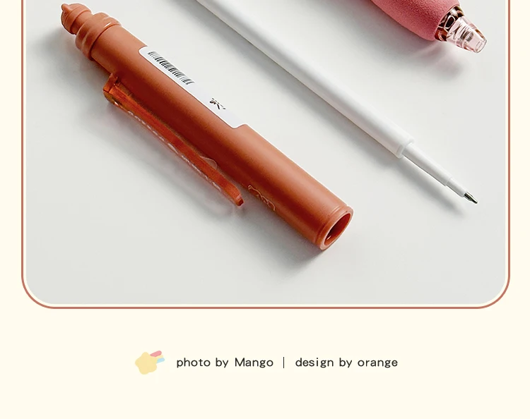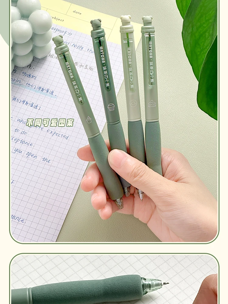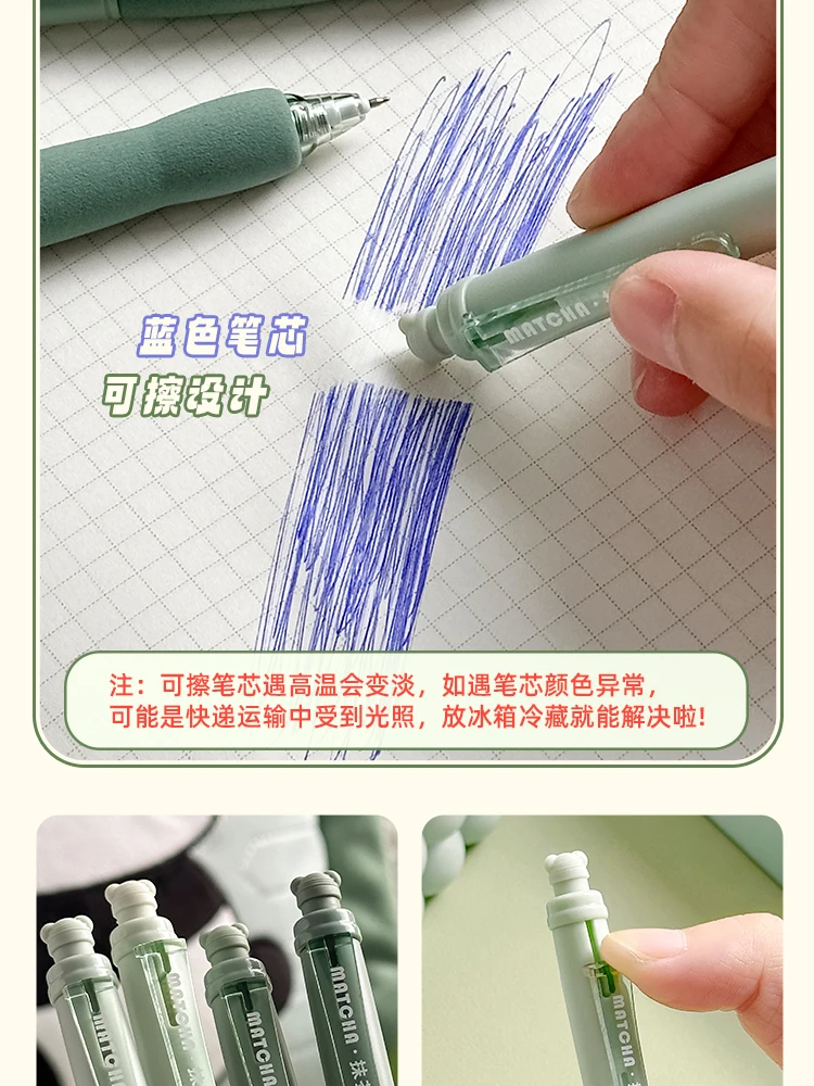 I loved them! They come with a red cap that you have to take out in order to write. The ink is light, but it is normal for erasable ink pens. Eraser is the bear above. To get the tip of the pen you have to lower the plastic part that says “Matcha”