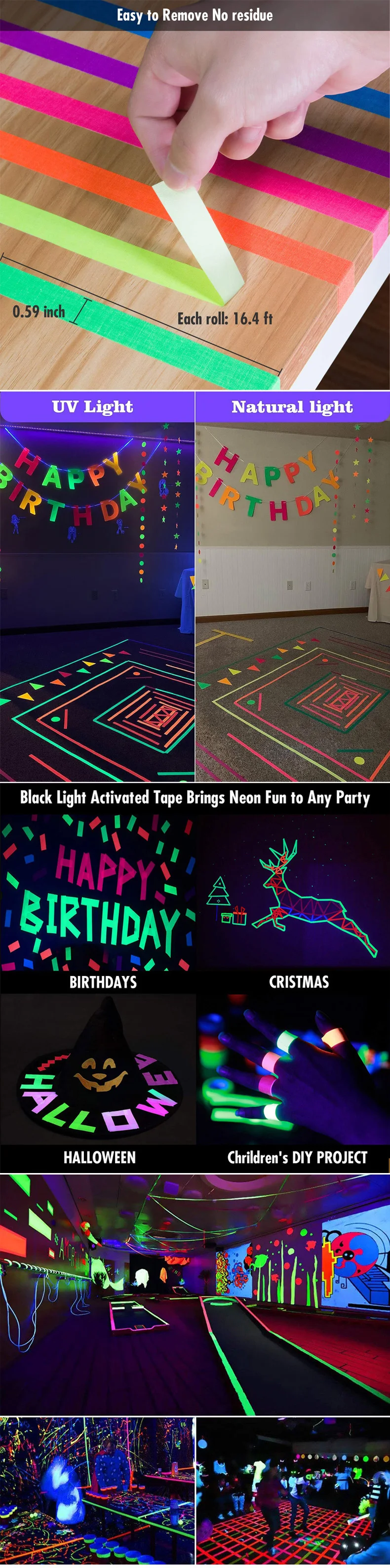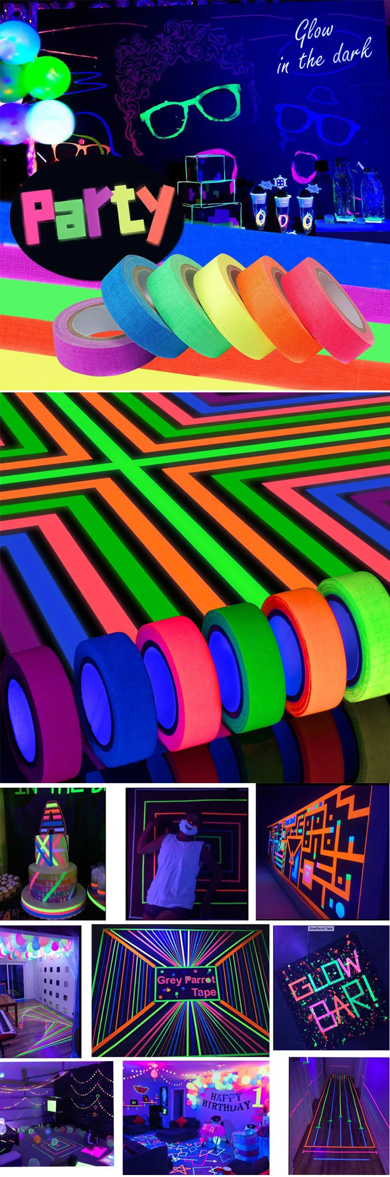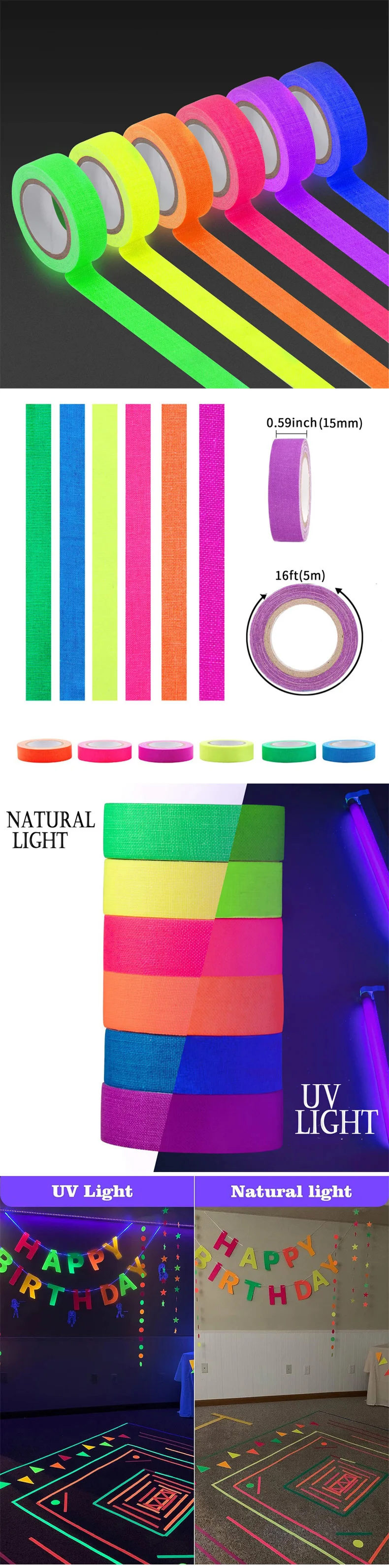 5Meter 6 Colors Neon Gaffer Cloth Tape Fluorescent Rainbow Color Party Non-Reflective Glow in The Dark Tape Under UV Black Light