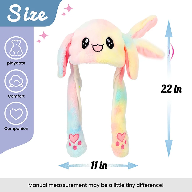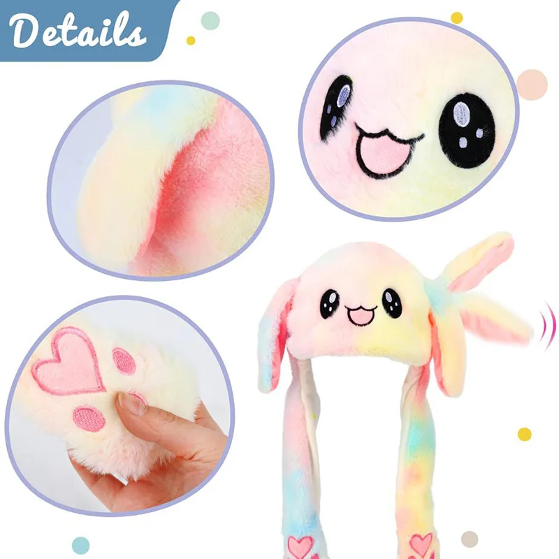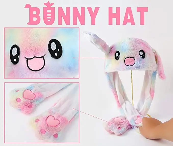 - 🐰Movable Bunny Ears Hat. The bunny hat has a built-in air pump device. When you press its two paws, the ears will beat. You can squeeze your paws rhythmically with the music, You can use bunny cap to shoot short videos and participate in parties, and your body can’t help dance !🐰Safe,High Quality Material. This jumping hat fabric is made of 100% polyester. Super soft, comfortable and smooth material brings you an unparalleled experience.