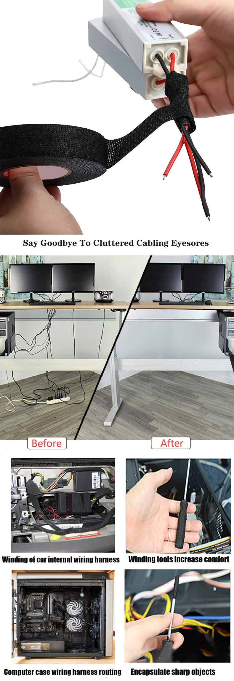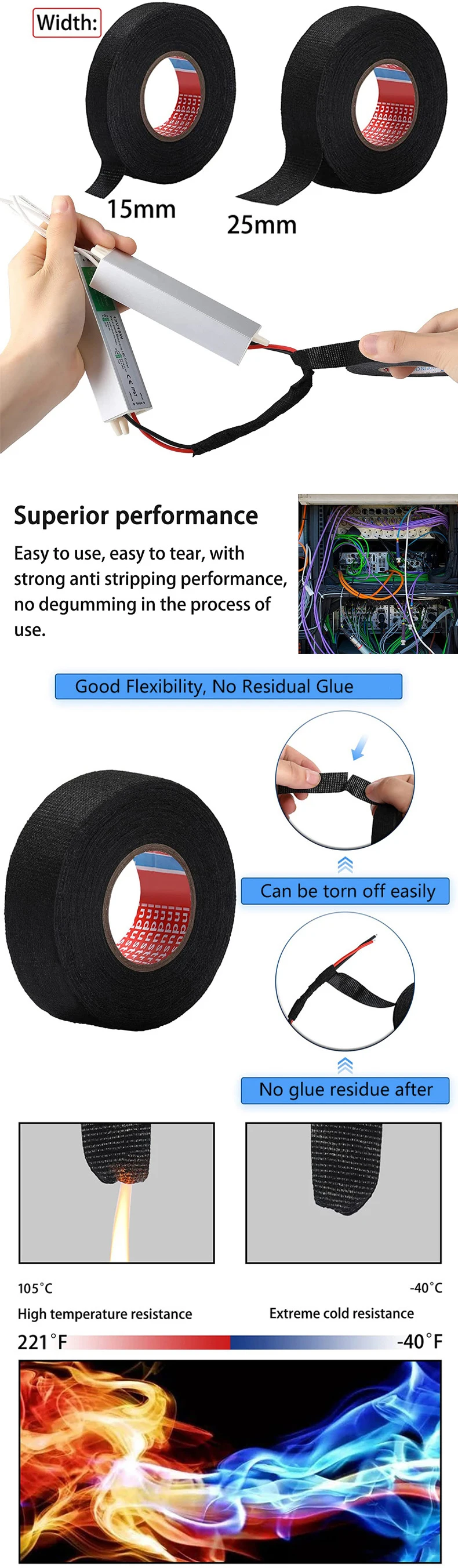 3. Car harness cloth tape is very convenient to use; just wrap the tape around the wire and gently tear it apart. No scissors or other tools are needed. The length of the tape can be determined according to your needs.